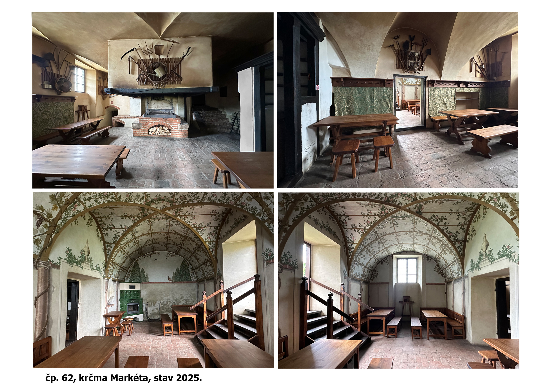 - Atraktivní historické prostředí, základní vybavenost tj. stoly, židle, lavice, otevřený krb, vytápění kachlovými kamny dřevem, osvětlení olejovým osvětlením, kuchyň se základním vybavením